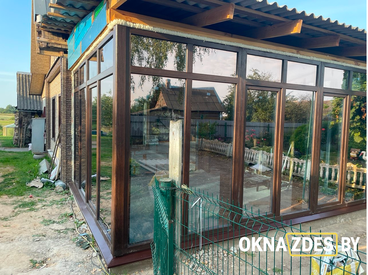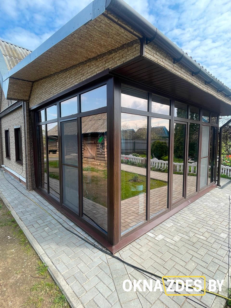 Терраса (веранда) ПВХ Salamander Streamline 76, стеклопакет 48 мм «бронза», фурнитура Roto — тёмный дуб