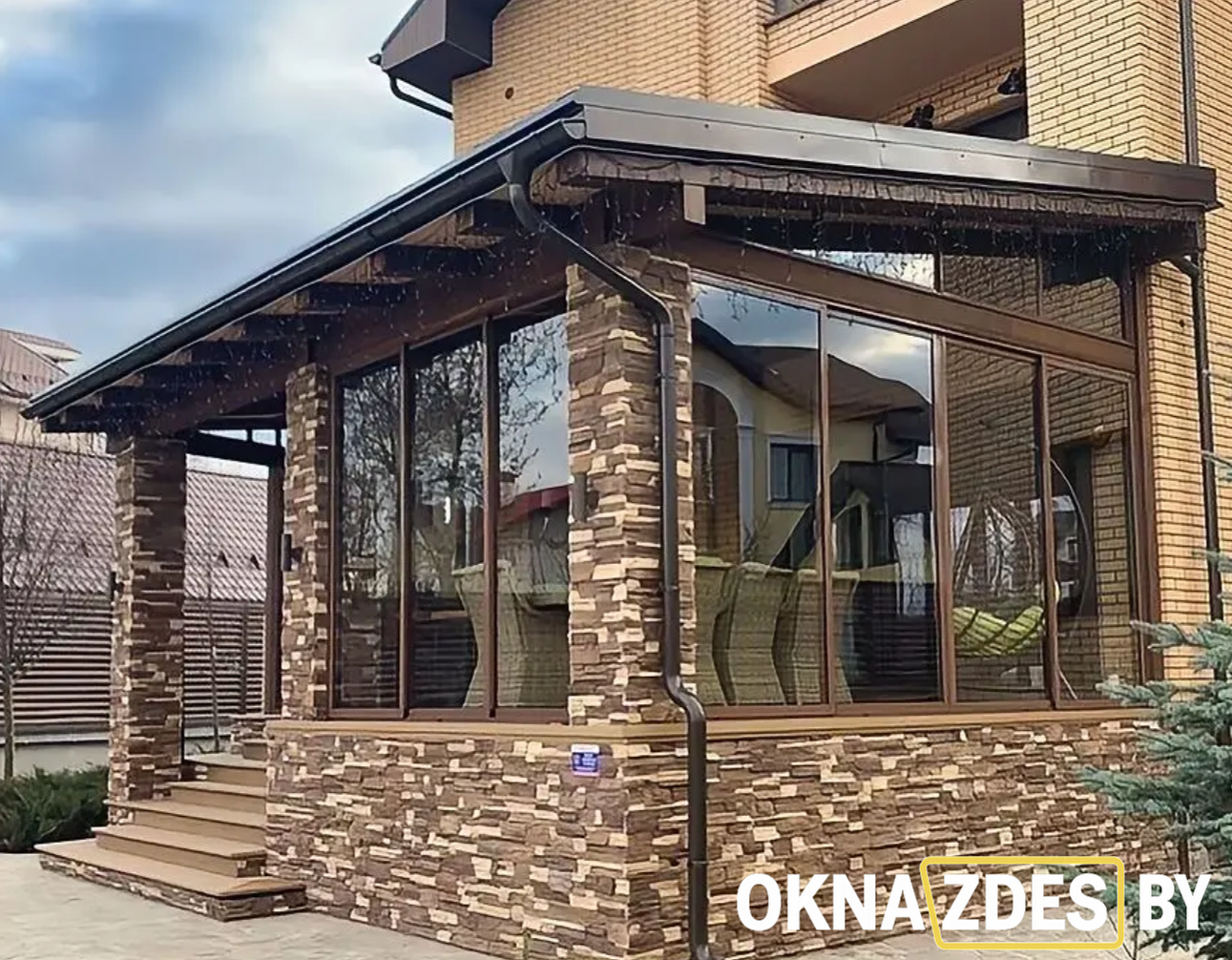 На фото — остекление террасы холодным алюминием с закалённым стеклом 6 мм. Конструкция обеспечивает максимальную прозрачность и аккуратную архитектурную интеграцию с фасадом дома.